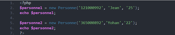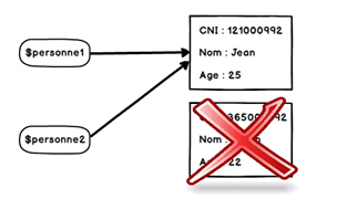 Nous avons créé deux objets: $personne1 et $personne2. $personne1 et $personne2 sont des références qui pointent vers différents objets « Personne ».